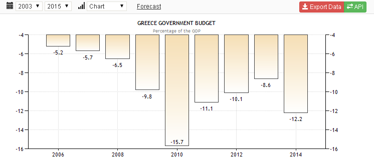 În 2009, guvernul Greciei a anunțat că deficitul lor bugetar – care fusese prognozat (cu un an înainte) a fi de 3.7% (cu 0.7% mai mult decât limita regulamentară impusă de UE), este în fapt 5.2%. Apoi, repede, s-a anunțat c-ar fi spre 9%. N-a rămas acolo mult pentru că s-a anunțat că deficitul lui 2009 va fi de 12.3%. După o nouă reevaluare s-a ajuns la numărul de 13.6%. Din poza de jos se pare că în 2009 deficitul a fost “numai” cu 300% mai mult decât cel promis – de 9.8%. După ce problema a explodat, în 2010, a fost 15.7% – un număr gigantic. Trebuie spus că Grecia a mascat – cu ajutorul unor bănci internaționale precum Goldman Sachs – un deficit mare ani întregi. Chiar și cifra oficială – mereu de peste 3% – ar fi trebuit să interzică Greciei participarea la UE dar optimismul pan-european a prevalat. Peste noapte dobânzile pentru un Stat atît de răvășit au crescut, tot mai mult, tot mai mult, până au ajuns la nivelul cămătăriei – peste 25%. Evident, cu asemenea dobânzi, Grecia ar fi dat curând faliment. Ce înseamnă faliment la nivel național? Același lucru ca și la nivelul individual: când cu venitul nu mai poți plăti nici măcar dobânzile împrumuturilor făcute atunci ești falit. Și falimentul, într-un stat înseamnă oprirea oricăror plăți bugetare: salarii, investiții, absolut totul.