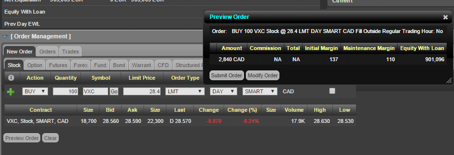 Din poză se vede că ordinul meu era de 100 de unități, 28.40$/unitate, deci 2840$ CAD + comision (care nu e calculat), ordin de zi (deci dacă nimeni nu e dispus să vândă 100 acțiuni de VXC cu 28.4$ CAD până la capătul zilei, ordinul va fi anulat.