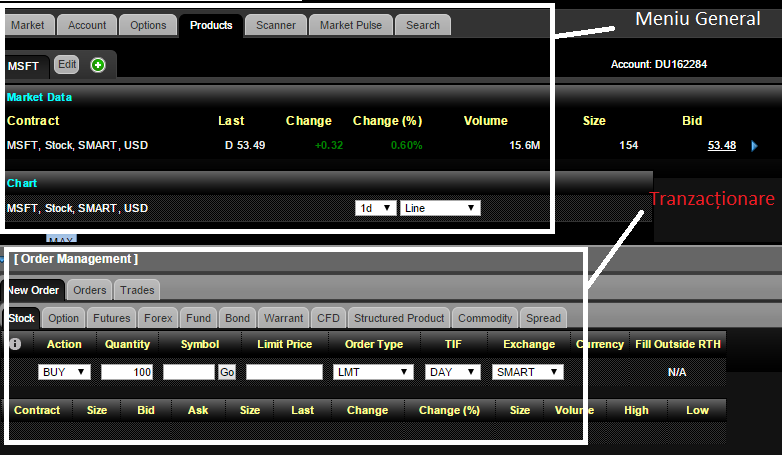Meniul are 2 zone – cea de meniu general și cea în care plasați ordinul de cumpărare/vânzare